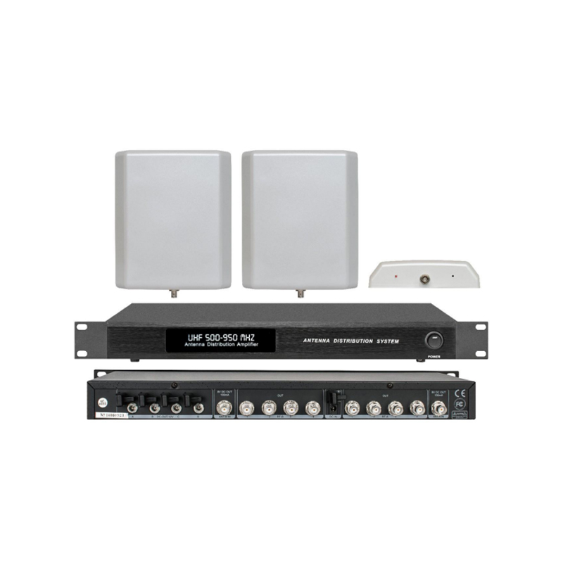 - Provides a multi-channel system using 2~4 UHF wireless series or other series of various automatic selection receivers, sharing a pair of antennas,